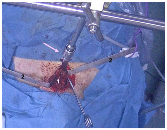 Intra-operatory capture: 1—cervical incision; 2—Farabeuf retractors; Cooper thymectomy retractor (pink arrow).