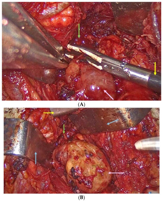 Intra- aspects: gross appearance of the upper mediastinum: (A) ectopic thyroid tissue (pink arrow), LigaSure sealer and divider (yellow arrow), the anterior compartment of the mediastinum (green arrow); (B) ectopic thyroid (pink arrow), Cooper thymectomy retractor (yellow arrow), the anterior compartment of the mediastinum (green arrow), Farabeuf retractors (blue arrows).