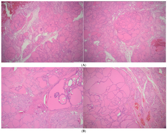 Pathological exam (microscopic aspects of ETTM; haematoxylin–eosin): aniso-follicular adenomatosis, hyperplastic epithelial areas with hyper-functional aspects, hemorrhage areas, siderophages, interstitial edema, and sclerosis. (A) 2×. (B) 4×.