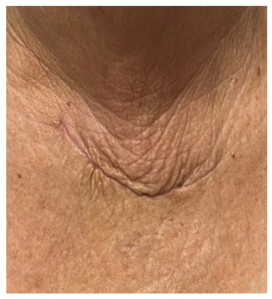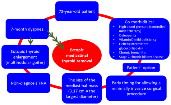 Another particular aspect of this case is the decision of surgery taking into account the patient’s age and co-morbidities. Since this strategy does not represent a guideline-based protocol, a multidisciplinary team opted for ETTM and neck thyroid removal due to the associated symptoms and due to the fact that the patient was in good health. In case of an ETTM increase, the minimally invasive procedure might not be feasible or may be too risky; thus, a traditional sternotomy is required. This comes with a more complicated panel of side effects (e.g., longer operation time, increased blood loss, a higher rate of transfusion, an elevated risk of pneumonia, atelectasis, pleural effusion, and pneumothorax, etc.) that increases the overall disease burden in a senior subject; hence, the timing of the intervention should be carefully taken into consideration, too [25,26,27,28]. The presence of controlled high blood pressure, mild kidney dysfunction, and osteopenia do not represent contraindications of thoracic surgery, but their long-term primary and secondary complications might impact the morbidity and mortality in certain circumstances, and they are part of a tailored strategy in ETTM [29,30,31,32,33] (Figure 13).
