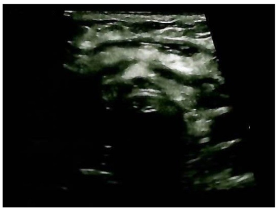 Anterior cervical ultrasonography after total thyroidectomy and ETTM removal: cervical edema and no thyroid tissue remnants.