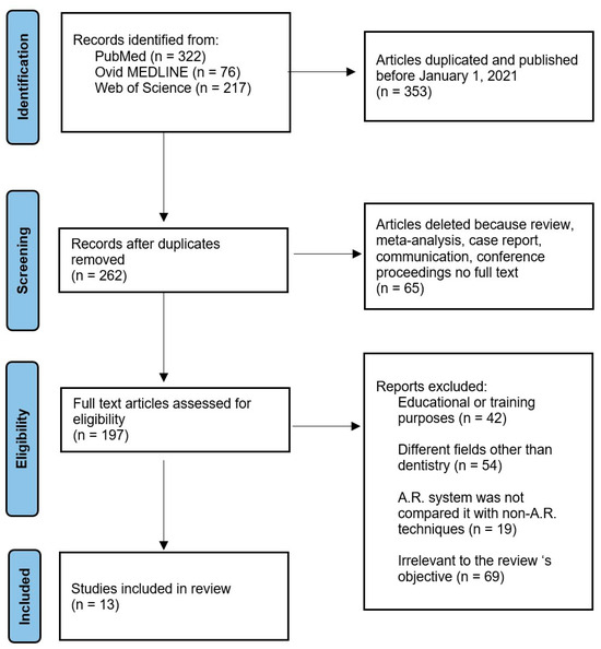 The initial search on scientific search engines yielded 615 results. Duplicate research and studies published before 1 January 2021 were excluded, resulting in a total of 262 studies. Out of these, 65 articles were excluded as they were reviews, meta-analyses, case reports, communications, and congress papers. After the initial selection, 197 studies underwent a full-text examination. Among these, 42 articles were discarded because they used AR for educational or training purposes, 54 used AR in fields other than dentistry, 19 used AR but did not compare it with non-AR techniques, and 69 were not aligned with the article. In total, 13 studies were included in this review [43,44,45,46,47,48,49,50,51,52,53,54,55] (Figure 1). The included papers are listed in Table 1.