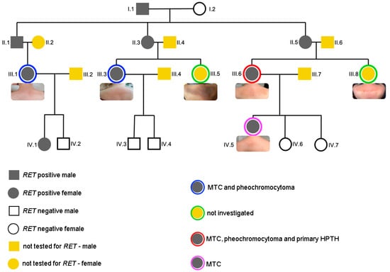 Genetic history of the RET-positive family with multiple endocrine neoplasia type 2 according to the available data of the family tree with regard to the genetic, endocrine, and cutaneous (lichen amyloidosis) insights (abbreviations: RET = Rearranged during transfection gene; MTC = medullary thyroid carcinoma; HPTH = primary hyperparathyroidism).