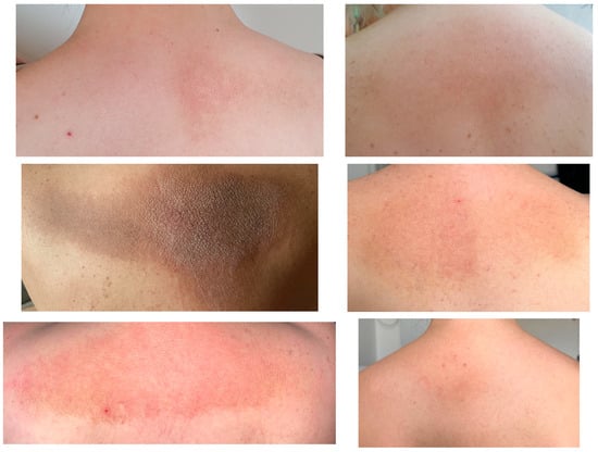 We identified six female patients with inter-scapular lesions, namely, lichen amyloidosis (patients III.1, III.3, III.5, III.6, III.9, and IV.5 according to the family tree), and only four of underwent genetic and endocrine testing (patients III.1, III.3, III.6, and IV.5). As seen in Figure 3, the most hyper-pigmented aspect was shown in patient III.5 (with a velvety plaque appearance associated with fine scales) while the most reddish appearance was in III.8, both these subjects with the largest involved area. Except for the youngest patient of 6-year-old (IV.5), all females were in their 30s and displayed the progressive cutaneous lesions a few years before. These subjects were two couples of sisters (III.3 and III.5, respectively, III.6 and III.8), and one couple was mother–daughter, as mentioned (III.6 and IV.5).