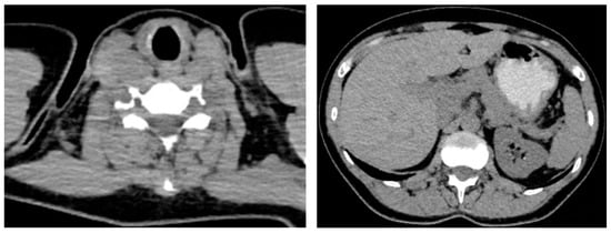 Intravenous contrast computed tomography (transversal plane): post-operatory aspect 12 years after total thyroidectomy for medullary thyroid carcinoma and bilateral adrenalectomy for bilateral pheochromocytoma: thyroid region without any aspects suggestive for remaining tissue (on the left); empty adrenal spaces without recurrence or remnants (on the right).