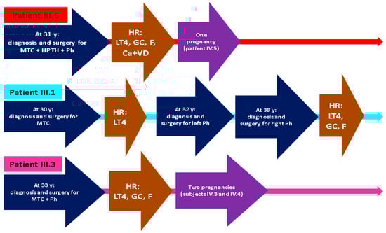 Chronology of each patient’s clinical events (abbreviations: Ca = calcium supplements; F = fludrocortisone; GC = glucocorticoids; HR = hormone replacement; LT4 = levothyroxine; MTC = medullary thyroid carcinoma; HPTH = primary hyperparathyroidism; Ph = pheochromocytoma; VD = vitamin D supplements; y = years).