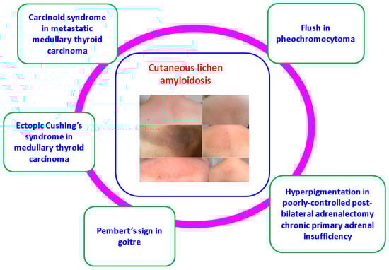 - Awareness of the dermatologic findings in patients diagnosed with medullary thyroid cancer and multiple endocrine neoplasia type 2 is essential, as lesions such as cutaneous lichen amyloidosis might represent the skin signature of the endocrine condition even before the actual endocrine manifestations.