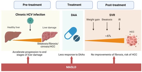 A synergistic interaction between the metabolic components associated with HCV infection and MASLD that may accelerate the development of liver damage and HCC has been documented [8]. Thus, the early diagnosis of MASLD in HCV-infected patients would allow for prompt clinical, therapeutic, and lifestyle interventions to prevent further disease severity. This review examines the mechanisms contributing to liver injury during the convergence of metabolic and viral-induced steatosis, and the role of therapeutic and dietary management is discussed.