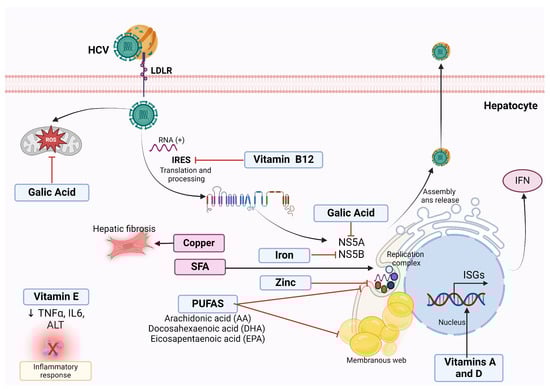Antiviral effect of nutrients against HCV infection. Polyunsaturated fatty acids (PUFAs) inhibit the formation of the membranous web necessary for successful HCV replication in vitro, thus reducing viral RNA replication and virus production. Gallic acid downregulates the expression of NS5A HCV protein required for HCV replication and decreases the ROS derivates from HCV infection in vitro. Vitamin B12 inhibits HCV internal ribosome entry site (IRES), essential for HCV translation, thus limiting HCV persistence in vitro. Vitamin E reduces TNFα and IL-6, suggesting an anti-inflammatory effect. Vitamins A and D induce the transcription of type-1 IFNs, enhancing the effect of IFN on HCV. Iron Inhibits NS5B polymerase activity in vitro. Zinc reduces HCV replication in vitro. On the contrary, saturated fatty acids (SFA) are necessary for HCV replication. Hepatic copper increases hepatic fibrosis and correlates positively with type IV collagen.