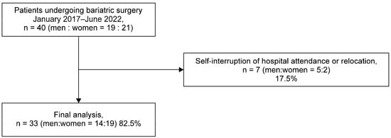 A total of 40 patients underwent surgery during the study period. Of these, seven (five men and two women) were excluded owing to self-interruption of hospital attendance or relocation. Data from the remaining 33 patients (14 men and 19 women) were analyzed (Figure 1).