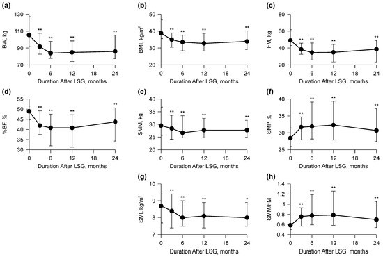 Graph of body composition before and 24 months after laparoscopic sleeve gastrectomy (LSG). The points in the graph represent medians with interquartile range values. (a) Body weight (BW) was the lowest after 6 months. (b) Body mass index (BMI) was the lowest after 12 months. (c) Fat mass (FM) was the lowest after 6 months. (d) Percent body fat (%BF) was the lowest at 6 and 12 months. (e) Skeletal muscle mass (SMM) was the lowest after 6 months. (f) Skeletal muscle percentage (SMP) was the highest after 12 months. (g) Skeletal muscle index (SMI) was the lowest after 6 and 24 months. (h) Skeletal muscle mass to fat mass ratio (SMM/FM) was the highest after 12 months. * p < 0.05, ** p < 0.001 vs. 0 months.