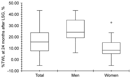 As shown in Figure 3, the total median %TWL at 24 months after LSG was 15.6% (7.7–23.8%), and it was higher for men (24.2% [19.3–34.9%]) than for women (8.2% [5.2–15.0%], p < 0.001).