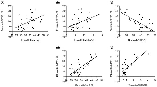 Correlation between the 24-month-percentage of total weight loss (%TWL) and each variable. (a) The zero-month skeletal muscle mass (SMM) exhibited a positive correlation with the %TWL at 24 months (rs = 0.46, p = 0.007). (b) The zero-month skeletal muscle index (SMI) was positively correlated with the %TWL at 24 months (rs = 0.41, p = 0.017). (c) The 12-month percent body fat (%BF) was negatively correlated with the %TWL at 24 months (rs = −0.61, p < 0.001). (d) The 12-month skeletal muscle mass (SMP) exhibited a positive correlation with the %TWL at 24 months (rs = 0.61, p < 0.001). (e) The 12-month SMM to FM ratio (SMM/FM) was positively correlated with the %TWL at 24 months (rs = 0.61, p < 0.001).