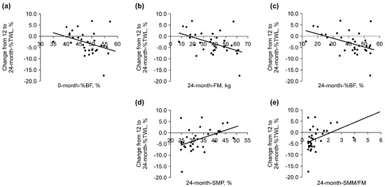 Correlation between the change in the percentage of total weight loss (%TWL) from 12 to 24 months and each variable. (a) The zero-month percent body fat (%BF) was negatively correlated with the change in the %TWL from 12 to 24 months (rs = −0.44, p = 0.011). (b) The 24-month fat mass (FM) was negatively correlated with the change in the %TWL from 12 to 24 months (rs = −0.47, p = 0.006). (c) The 24-month %BF was negatively correlated with the change in the %TWL from 12 to 24 months (rs = −0.43, p = 0.012). (d) The 24-month skeletal muscle percentage (SMP) was positively correlated with the change in the %TWL from 12 to 24 months (rs = 0.44, p = 0.010). (e) The 24-month skeletal muscle mass to fat mass ratio (SMM/FM) was positively correlated with the change in the %TWL from 12 to 24 months (rs = 0.45, p = 0.008).