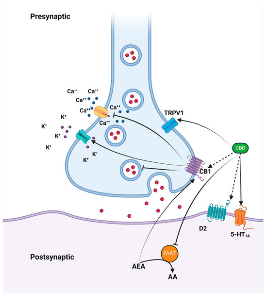 Endocannabinoids function as retrograde messengers, traveling to the pre-synapse to activate cannabinoid receptors [31]. They cause plasticity in the synapses through post-synaptic neuron depolarization and an influx of calcium ions, eventually causing long-term synaptic depression mediated by endocannabinoids [31]. Figure 1 demonstrates the mechanism by which CBD affects psychotic disorders.