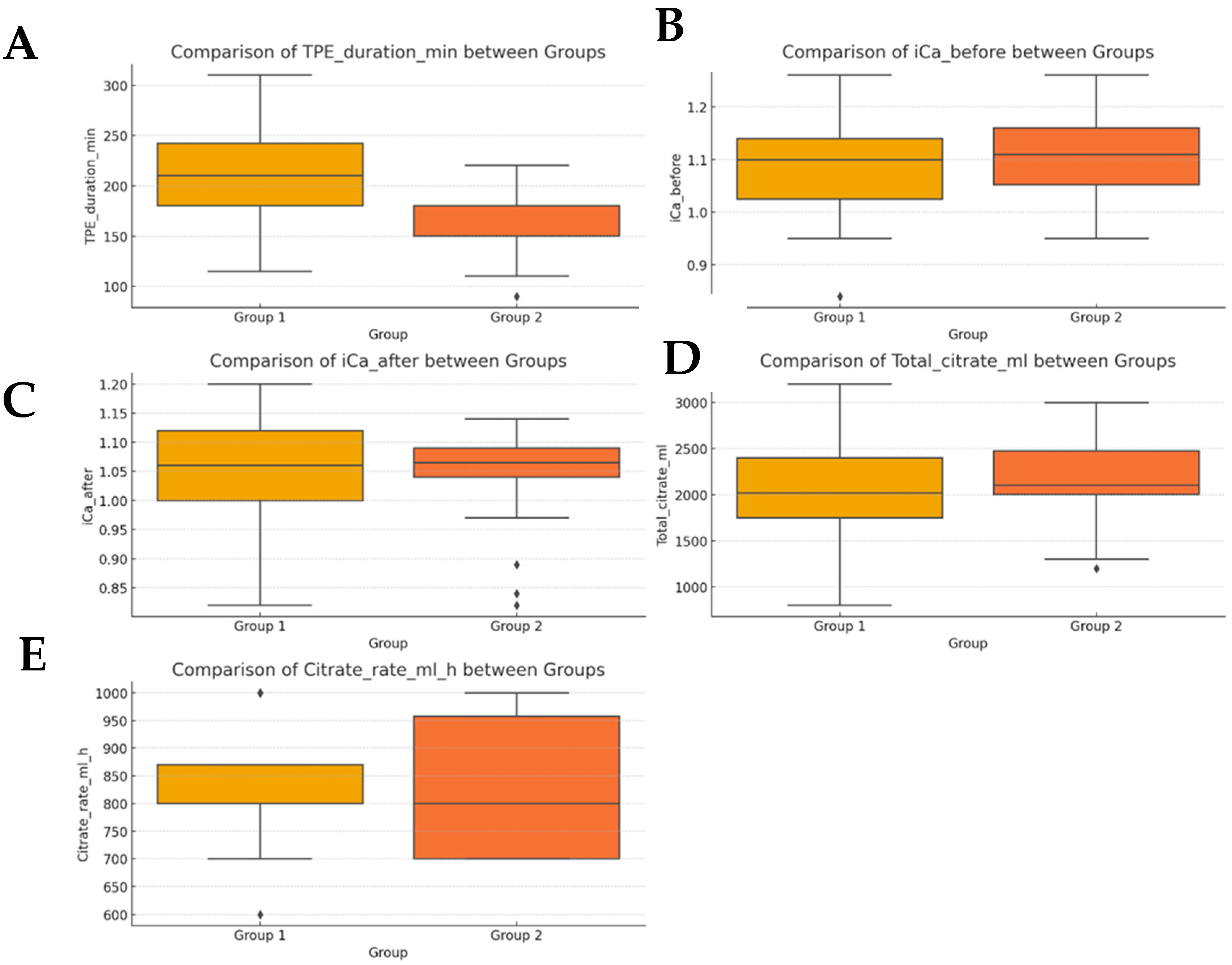 Ionized calcium (after) | 1.05 ± 0.10 mmol/L | 1.04 ± 0.08 mmol/L |