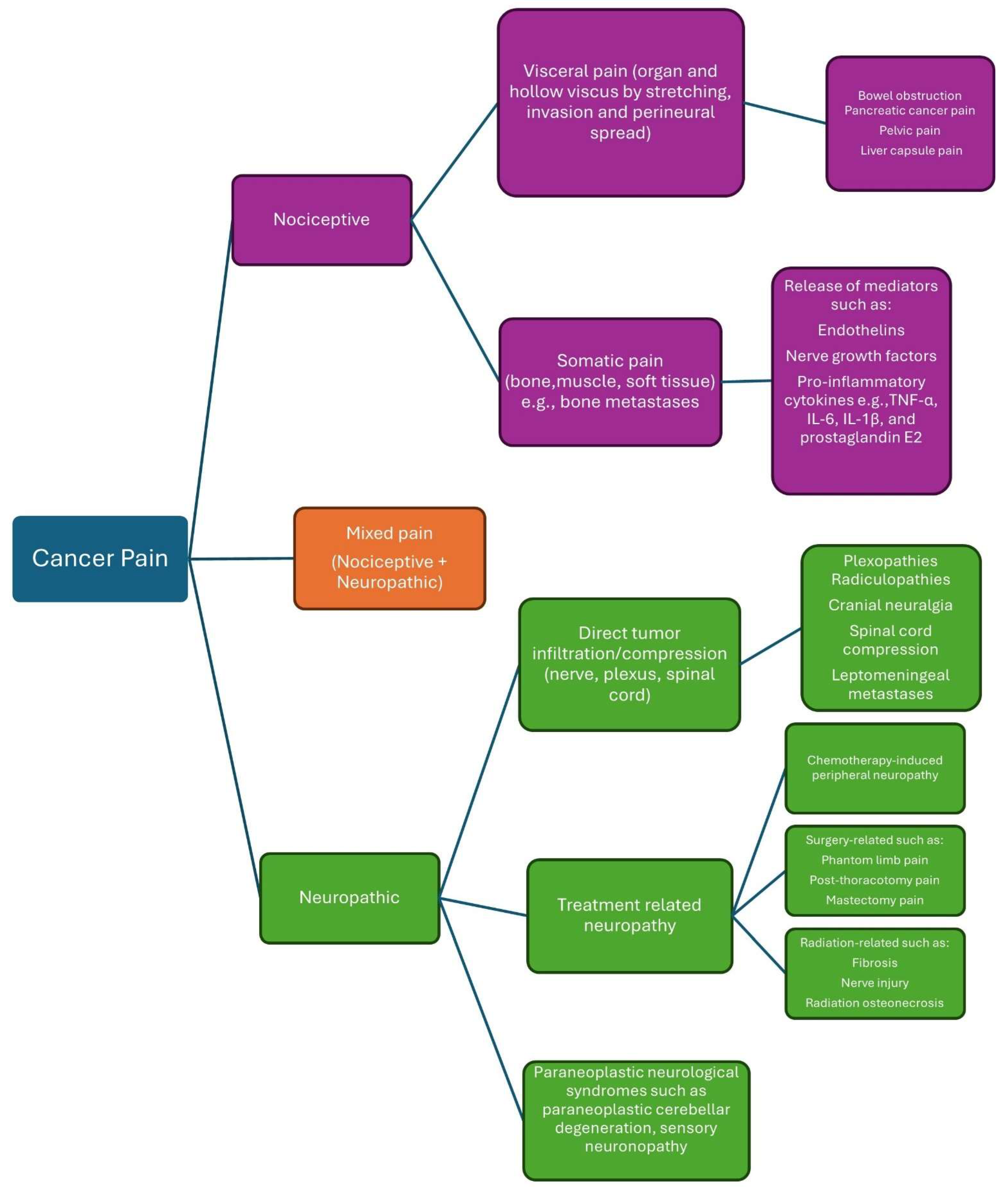 Cancer pain is multifactorial, involving nociceptive (somatic or visceral) pain, neuropathic pain, and/or a mix of both (