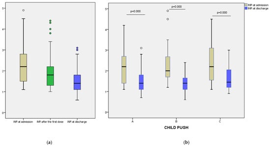 (a) INR values at admission, after the first dose of vitamin K and at discharge; (b) INR values at admission and at discharge, stratified by Child–Pugh categories.