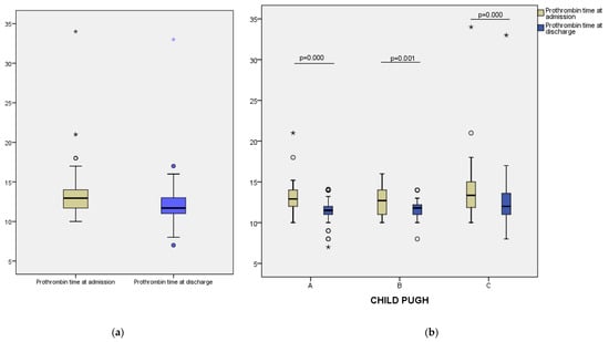 (a) Changes in prothrombin time between admission and discharge; (b) changes in prothrombin time (outliers values are marked with circle and *) between admission and discharge stratified by Child–Pugh categories.