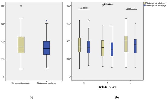 (a) Fibrinogen levels at admission and discharge; (b) Fibrinogen levels at admission and discharge stratified by Child–Pugh categories.