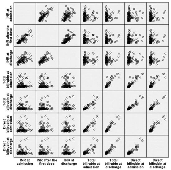Scatter plot matrix illustrating Spearman’s correlation between INR values (at admission, 24 h, and discharge) and bilirubin levels (total and direct) at admission and discharge.