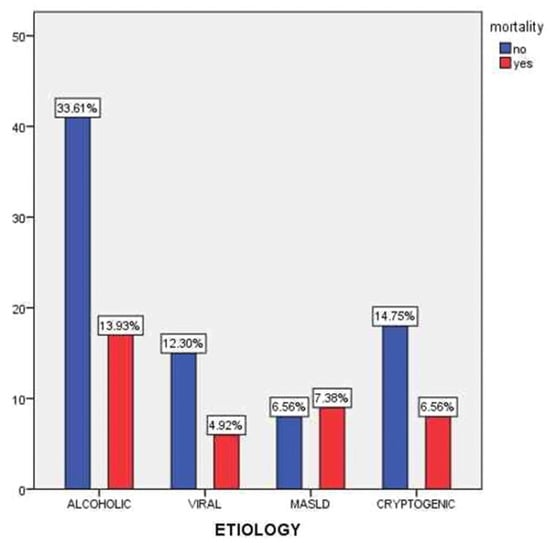 Figure 5 presents the distribution of mortality across different etiologies of liver cirrhosis. The highest number of deaths was observed among patients with alcohol-related cirrhosis (13.93%), followed by cryptogenic cirrhosis (6.56%) and MASLD (7.38%). Although alcoholic cirrhosis was the most prevalent etiology (47.54% of the cohort), the associated mortality rate was notably elevated, likely due to a more severe clinical course, frequent comorbidities, and poor adherence to medical recommendations. Despite representing a numerically smaller subgroup, patients with MASLD exhibited a relatively high mortality rate, which may reflect the often-silent progression of metabolic liver disease and delayed diagnosis. Conversely, viral cirrhosis showed the lowest mortality (4.92%), potentially due to the beneficial effects of antiviral therapy and better clinical follow-up.