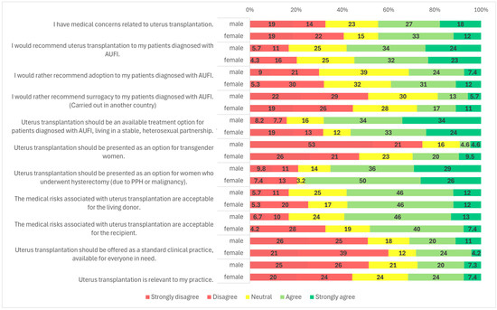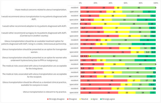 Respondents were also asked whether they found the medical risks associated with living donors in UTx acceptable. Overall, 58.0% (167/288) agreed (Figure 1). The proportion was higher among specialists than residents (59.8% vs. 41.4%). Using a one-sided Fisher’s exact test, this difference was statistically significant (p = 0.044), consistent with our a priori expectation that specialists would be more supportive. No significant differences were observed by primary specialty, gender, or age (Figure 2, Figure 4 and Figure 5; Supplementary Data S1). Regarding acceptance of medical risks to the recipient, 55.2% (n = 159/288) of respondents agreed that these were acceptable (Figure 1). A statistically significant difference was found based on gender (p = 0.001): 59.1% (n = 114/193) of male respondents agreed, compared to 47.4% (n = 45/95) of female respondents. Additionally, 33.7% (n = 32/95) of women and 17.1% (n = 33/193) of men disagreed with the statement (Figure 4). No significant differences were observed based on age, specialty, or medical qualification (Figure 2, Figure 3 and Figure 5).