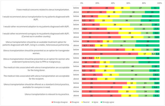 Our multidisciplinary research team is committed to establishing UTx as an available treatment option for patients with AUFI in Hungary. In preparation for clinical implementation, we have conducted a series of preclinical studies involving both animal models and human cadavers [13,14]. The aim of the present study was to assess the perceptions and attitudes of obstetricians/gynecologists and professionals associated with transplantation within the Hungarian medical community. These two specialist groups were selected because of their likely involvement in future UTx procedures, and their points of view, risk assessments, and professional opinions may differ. Insights gained from this study will inform professional discourse and support the development of national strategies to introduce UTx as a treatment modality for AUFI in Hungary.