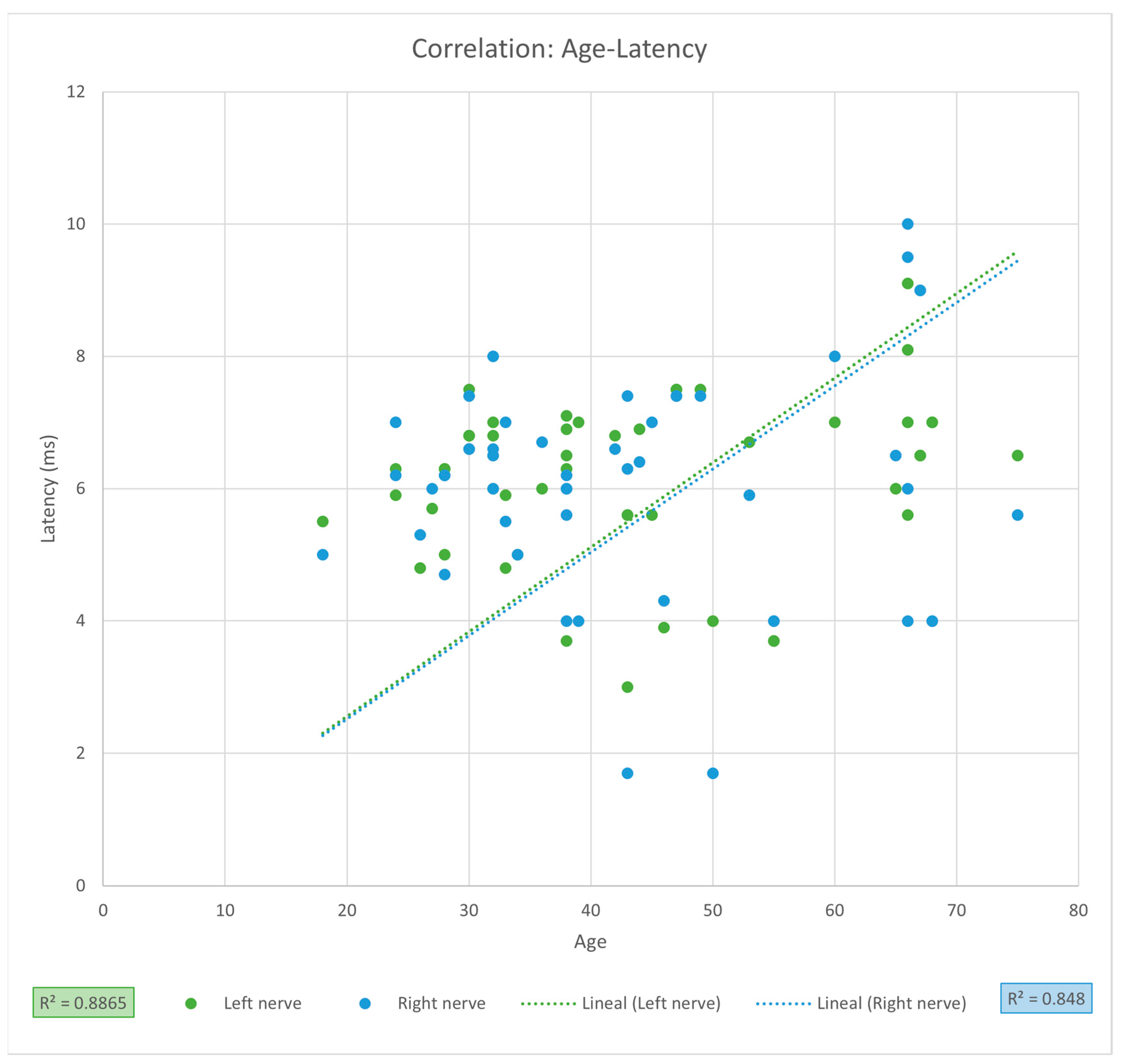 p = 0.5206), suggesting that there is a high probability that latency may be affected by age but not yet statistically significant, this could be due to the small sample size of our study, which is reflected by the high dispersion of the observed values and the CI. Studies involving larger sample sizes are needed to prove positive correlation between age and PNC latency.