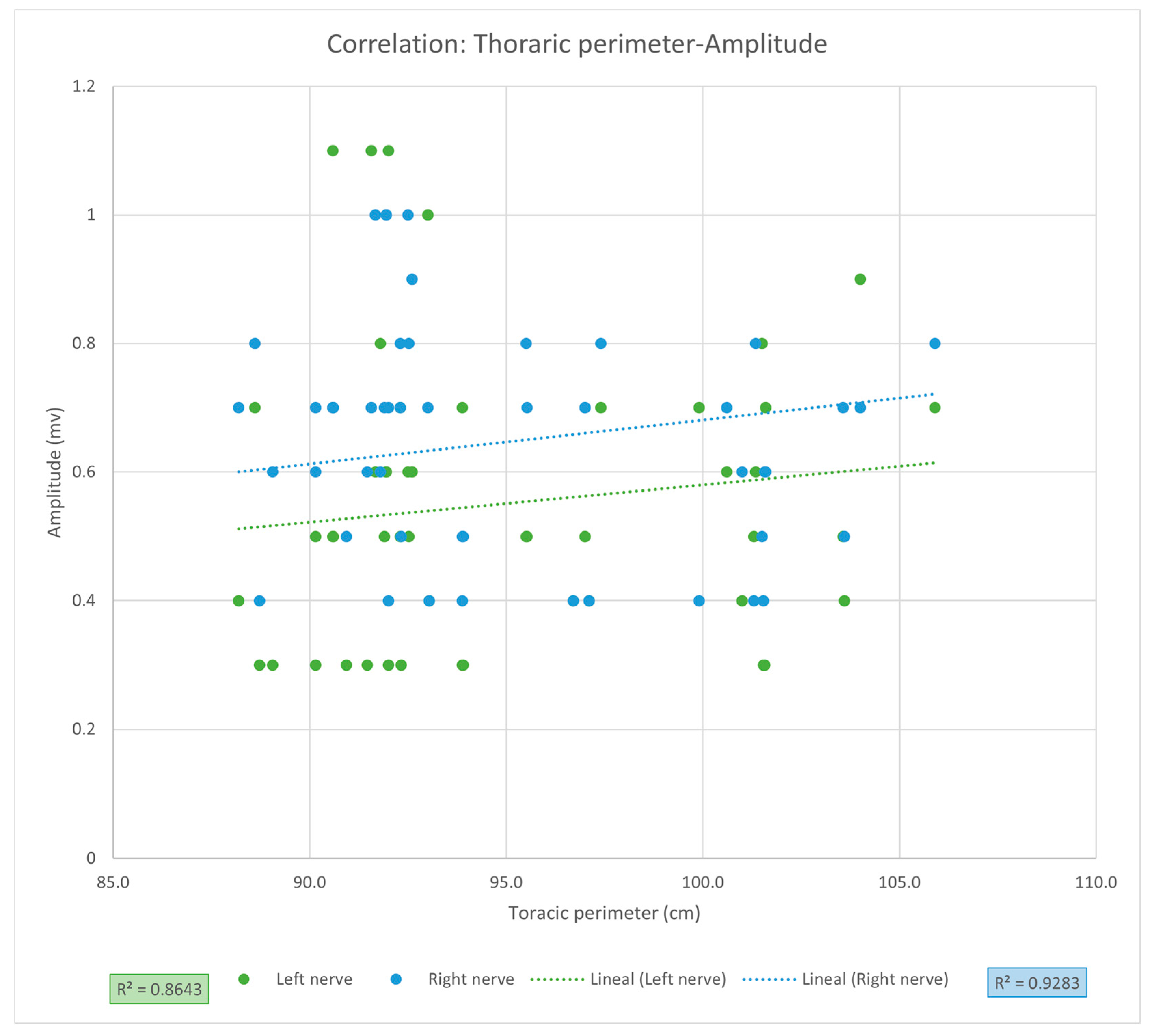 r = 0.9635, CI [0.9362, 1.1968]; for LPN and RPN, respectively), we did not find a statistically significant relationship between PNC amplitude and thoracic circumference. However, even with the strong coefficient of correlation for both phrenic nerves, suggesting a possible relationship between these variables, the non-significant difference and the amplitude of the CIs could be due to the small sample size of our study and the high dispersion of values in our patient sample, which could be confirmed in a study with a larger sample size.