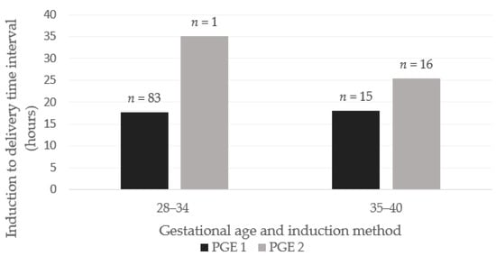 There was no significant difference in induction-to-delivery interval between the two methods when comparing lower and higher gestational ages (28 to 34 weeks, p = 0.18; for 35–40 weeks, p = 0.343), as shown in Figure 1.
