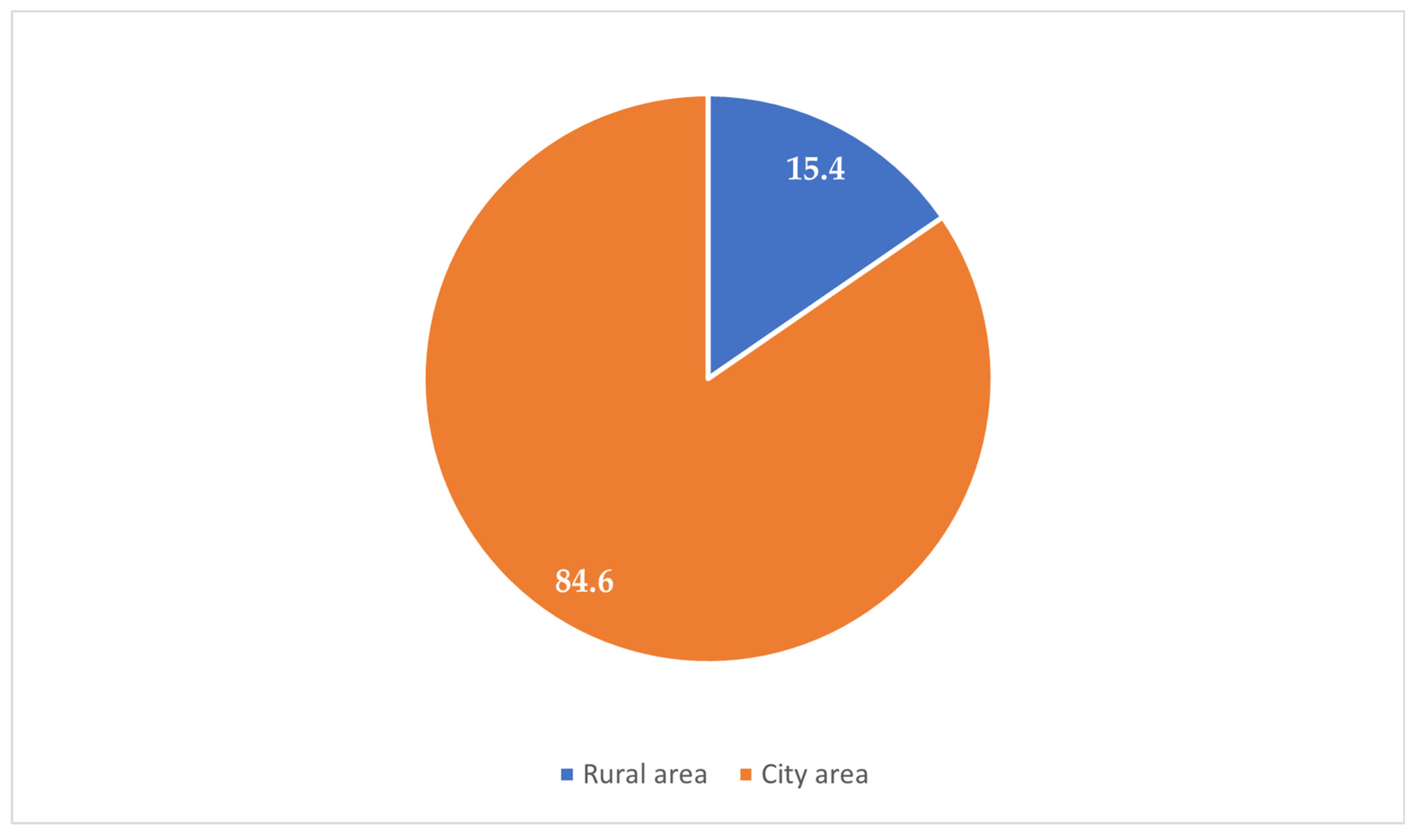 The majority of the participants (84.6%) resided in urban areas, while 15.4% were from rural zones (