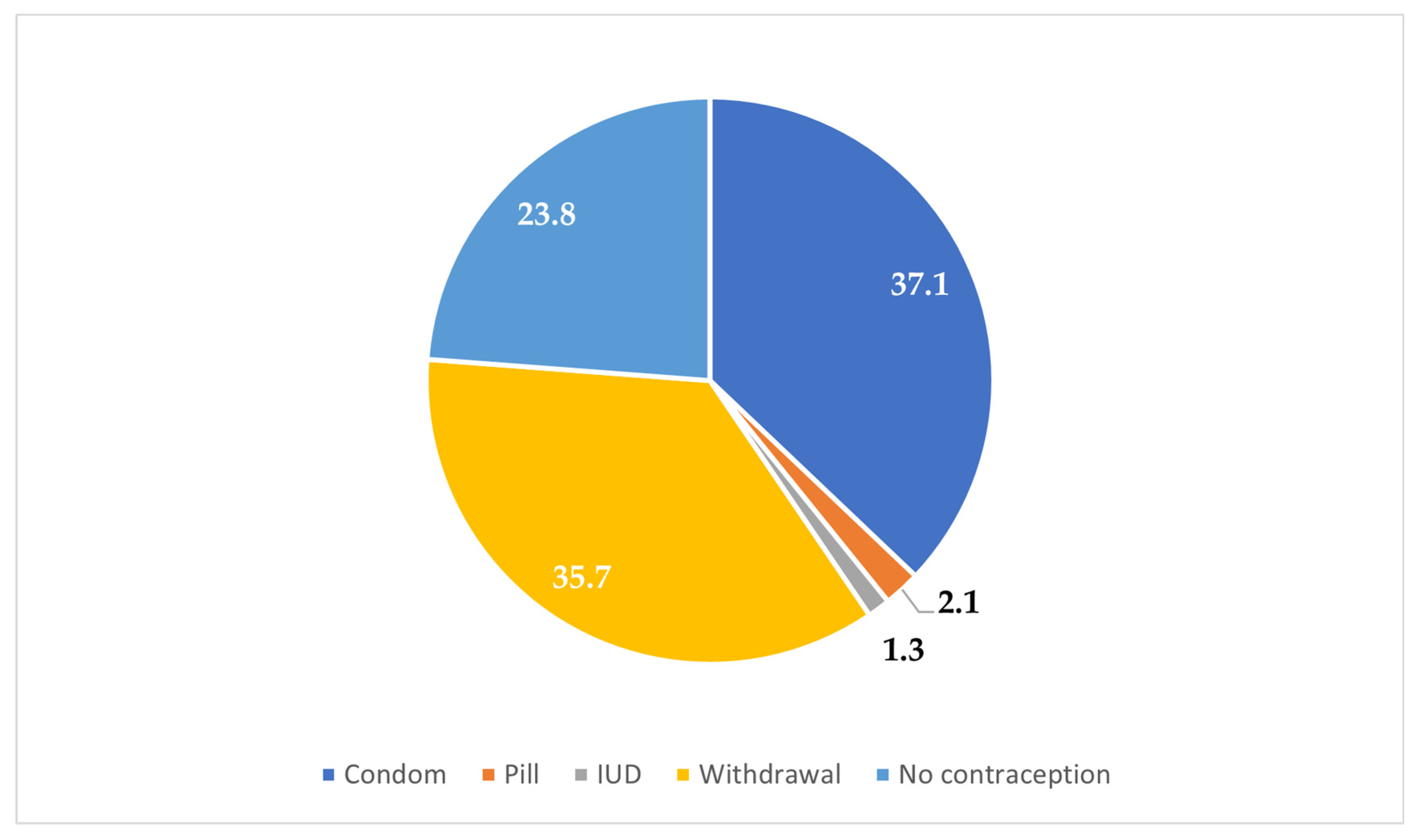 Figure 2). Condoms were the most commonly reported (37.1%) method used during the first sexual encounter, followed by withdrawal (35.7%). A notable portion (23.8%) did not use any contraception at all, and a small number reported using the contraceptive pill (2.1%) or an IUD (1.3%) (