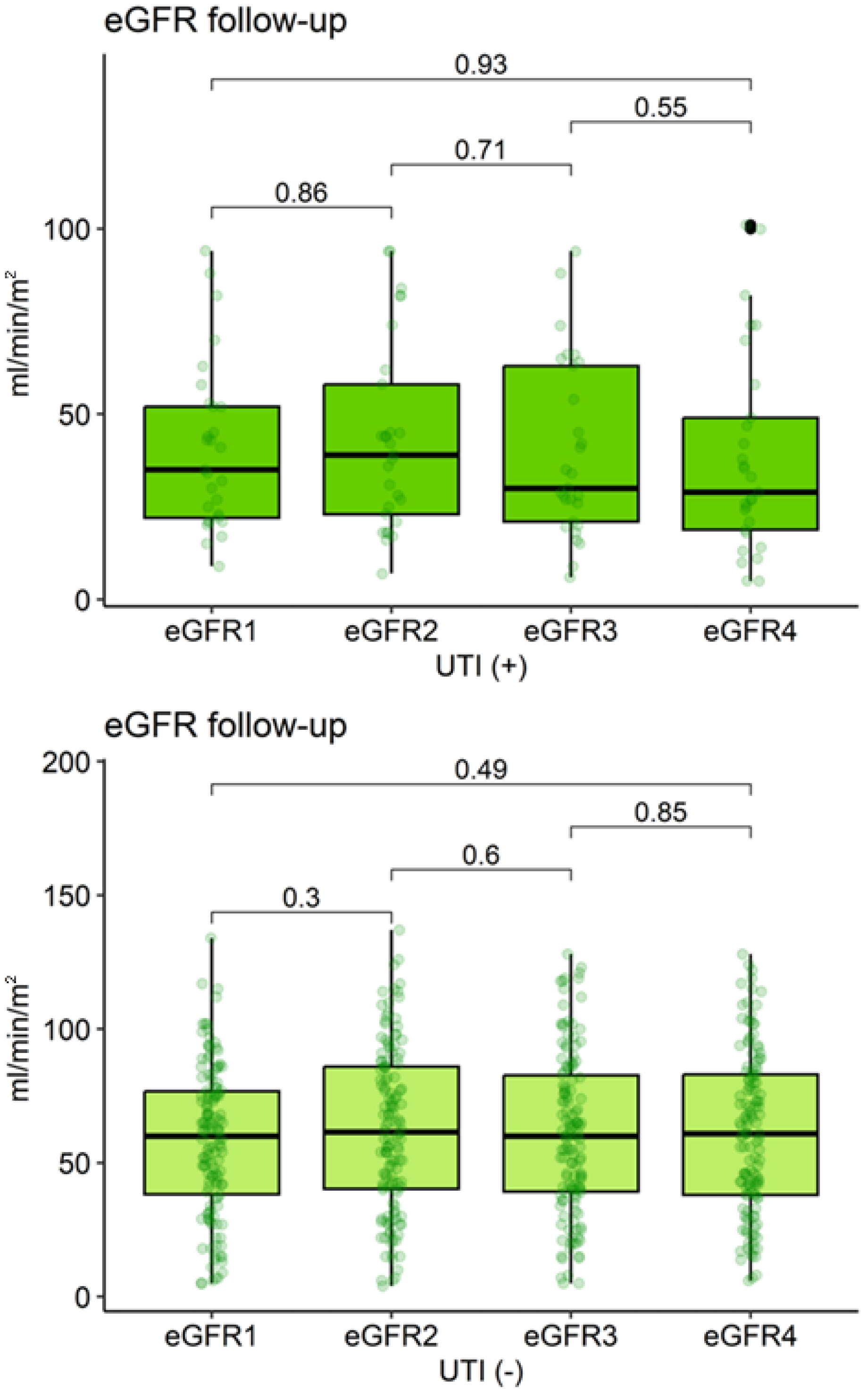 eGFR: Estimated glomerular filtration rate; UTI: Urinary tract infection; 1 Friedman test; 2 Wilcoxon rank-sum test.