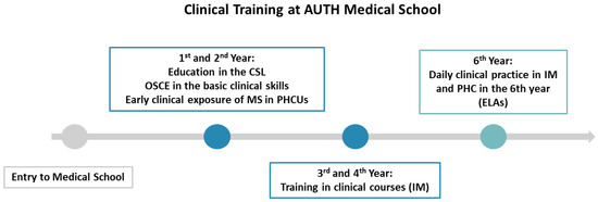 The figure illustrates the clinical education at AUTH Medical School. AUTH: Aristotle University of Thessaloniki, CSL: Clinical skills lab, ELAs: Experiential learning activities, MS: Medical students, IM: Internal medicine, OSCE: Objective structured clinical examination, PHC: Primary healthcare, PHCUs: Primary healthcare units.