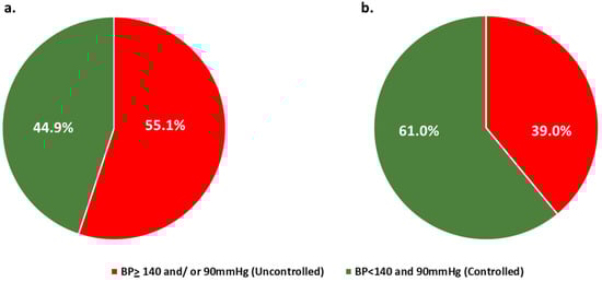 The prevalence of hypertension in this study was 56.7%. In our sample, the control of hypertension was 45%, and the control under treatment was 61%. In PURE, a large cross-sectional, population-based study from 17 countries, the prevalence of hypertension was 40.8% and 32.5% of treated individuals had their BP controlled [32]. The differences in control rates between our study and PURE could potentially be attributed to the mixed-income countries that were included in this study, as in lower-income countries, lower control rates were reported [32]. The findings from the May Measurement Month (MMM) screening campaign for hypertension (60 countries, 715,518 participants) reported a prevalence of 36.0% and a control under treatment rate of 52.9% [5]. In agreement with our findings, 58.3% of treated hypertensives in the IBERICAN—a study conducted at PHCUs in Spain with 8066 participants—had their BP controlled [33]. Results from a screening survey in Italy (1354 participants, mean age: 56.3 ± 15.3 years) reported that 46.5% of hypertensives were controlled, in accordance with our findings [34].