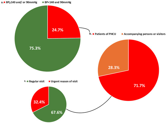 (a) Prevalence of hypertension among individuals not receiving antihypertensive medication. (b) Type of visitor among newly diagnosed hypertensive individuals (patient vs. accompanying person/visitor). (c) Reasons for PHCU visits among newly diagnosed hypertensive patients. BP: blood pressure, PHCU: Primary healthcare units.
