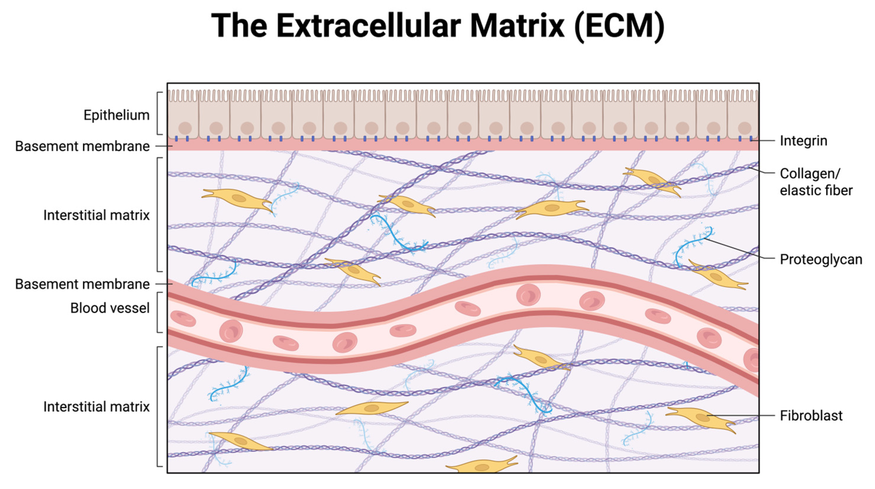 Figure 1. Organization of the extracellular matrix (ECM) in abdominal wall fascia. Schematic showing epithelium, basement membrane, and interstitial matrix with key components (collagen/elastin fibers, proteoglycans) and cells (fibroblasts) linked via integrins.