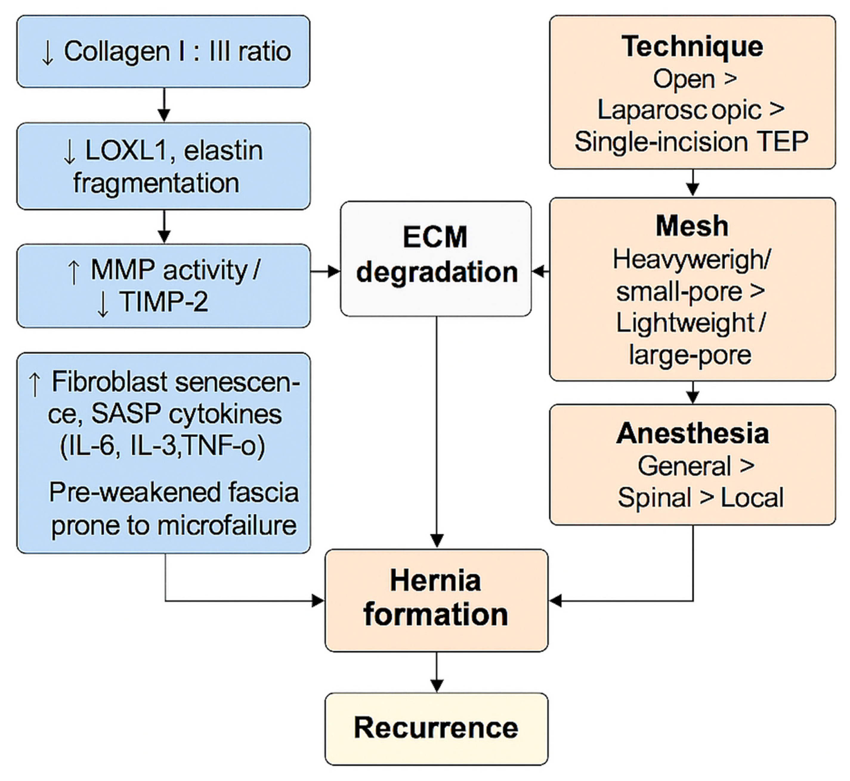 Figure 3. The double hit hypothesis summary flow chart. This figure shows that hernias result from a mix of biological weakness and surgical factors. On the biological side, a lower collagen I to III ratio, reduced LOXL1, increased MMP activity, and fibroblast aging all break down the extracellular matrix. This leaves the fascia weakened and more likely to fail. On the surgical side, choices such as the repair technique, the mesh used, and the type of anesthesia can add mechanical stress or inflammation. Both pathways lead to extracellular matrix degradation, hernia formation, and eventually recurrence.