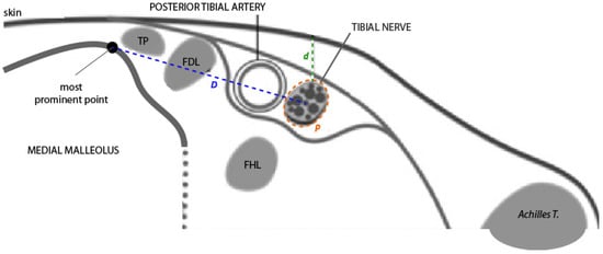 - Depth (d): perpendicular distance from the skin surface to the upper edge of the tibial nerve perimeter.