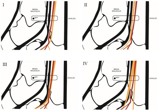 Diagram of the anatomical relationship types between the tibial nerve and the posterior tibial artery. Type I: The tibial nerve is located posterior to the posterior tibial artery. Type II: The tibial nerve is located anterior to the posterior tibial artery. Type III: The tibial nerve is in a lateral position relative to the posterior tibial artery. Type IV: A bifurcation of the tibial nerve is observed. MPP = Most prominent point. Source: Authors owns elaboration.