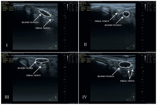 Anatomical relationship between the tibial nerve and the posterior tibial artery observed in the ultrasound study at the retromalleolar level. Type of anatomical relationship: Type I: TN posterior to PTA; Type II: TN anterior to PTA; Type III: TN lateral to PTA; Type IV: bifurcated TN).