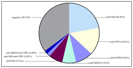 - Babu, A.K.; Mizaj, Z.; Thomas, J.; Chacko, M. Clinical Significance of Myositis-Specific and Myositis-Associated Antibody Profiles in Dermatomyositis. Indian Dermatol. Online J. 2022, 14, 55–60. [Google Scholar] [CrossRef] [PubMed]