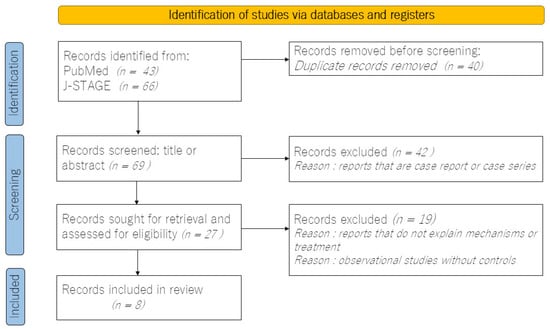 A comprehensive electronic search was conducted on the PubMed and J-stage databases for articles in English that contained the keywords “schizophrenia”, “constipation”, “antipsychotics”, and “complications” in the title or abstract. The search covered the period from January 2015 to December 2024. The full text of the retrieved articles was examined, excluding case series. Subsequently, studies that did not address mechanisms or treatments, or that lacked a comparison control group, were excluded. The initial screening and selection process was conducted by the author. Initially, 69 abstracts were reviewed; however, the majority were case series reports, and there were no randomized controlled trials, resulting in a limited number of studies that met the study’s objectives. Following this thorough review, a total of eight observational studies were included in the final review. However, the majority of these studies were secondary analyses of registered datasets rather than studies specifically focusing on constipation. The flowchart illustrating the search process is presented in Figure 1.