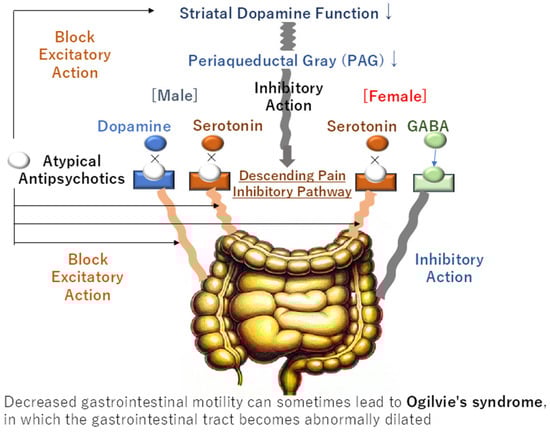 The relationship between the D2 receptor blockade, the primary pharmacological action of antipsychotics, and the defecation reflex has not been thoroughly examined until now. However, the potential involvement of dopamine in both central and peripheral components of the defecation reflex is a subject that merits further investigation. The defecation reflex is initiated when nociceptive stimulation of the colonic extension is transmitted to the brain by primary afferent neurons via ascending pain pathways. The brain’s response to nociceptive colonic distension involves the stimulation of the periaqueductal gray (PAG) via dopaminergic neurons. Consequently, the descending pain inhibitory pathways originating from the PAG are activated, leading to the alleviation of pain perception and the induction of the defecation reflex. The process of descending pain inhibitory pathway activation involves the release of neurotransmitters such as serotonin, noradrenaline, dopamine, and gamma-aminobutyric acid (GABA) into the spinal cord. These monoamines regulate the activity of the sacral nerves. The defecation reflex is initiated when the descending pain inhibitory pathway originating from the PAG stimulates the sacral spinal cord’s defecation center [15]. Antipsychotics have been observed to block dopamine neurons, thereby reducing PAG activation and potentially impacting the integrity of the defecation reflex.