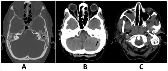 Computed tomography scans axial plane, obtained with and without contrast media administration at the level of the mastoid (A), showing complete opacification of the middle ear and mastoid without mastoid septal erosion (asterisk), and at the level of the sigmoid sinus showing a thrombotic lateral sinus (B), and the left jugular vein (C). A filling defect in the left sigmoid sinus (arrow) and jugular bulb (X), indicating acute thrombosis, is evident.