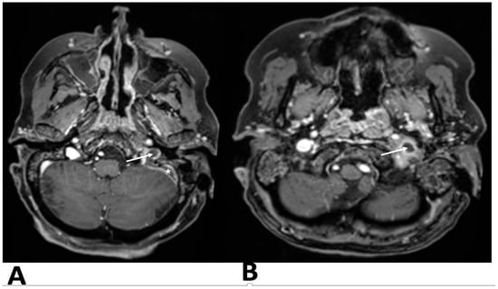 - Caldemeyer, K.S.; Mathews, V.P.; Azzarelli, B.; Smith, R.R. Jugular foramen: A review of the anatomy, masses, and imaging characteristics. Radiographics 1997, 17, 1123–1139. [Google Scholar] [CrossRef] [PubMed]