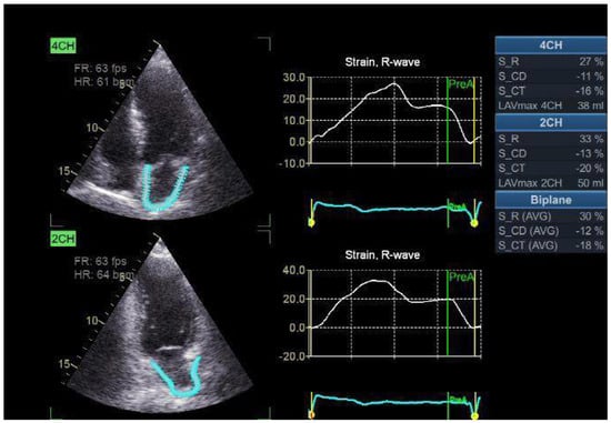 The two-dimensional strain analysis tool on the Echo PAC workstation (GE Healthcare) was used to measure LA strain and strain rate. The endocardial border outlines the whole myocardial area of interest (ROI) of the left atrium, much as it does for the left ventricle. With a default width of 3 mm, it is advised to use an adjustable ROI. The item’s size and location may be altered by the operator to meet the left atrial wall’s thickness without touching the pericardium. After dividing the atrial endocardium into six segments, the computer automatically rejected and removed parts that were not presented properly from the research. The software created the global longitudinal strain and strain rate profiles for each apical view. In order to accomplish appropriate tracking, the operator has the option of either retrying the imaging process or modifying the software settings, such as the smoothing algorithms and the ROI width. The electrocardiograph was recorded during three consecutive heartbeats, and the apical four-chamber and two-chamber images were acquired. The absolute strain value in the three LA phases—conduit strain in early diastole (LASct), reservoir strain in systole (LASr), and contraction strain in late diastole (LAScd)—is known as the LA strain. The first “0” reference point was the LV end-diastole. These strains are LASr, which is defined as the difference between the end-diastole and filling onset; LAScd, which is defined as the difference between the filling onset and the atrial contraction onset (prior to the Doppler A-wave onset); and LASct, which is defined as the difference between the filling onset and the atrial diastole end. The average of the relevant values from both views was used to estimate the global strain (Figure 2) [13].