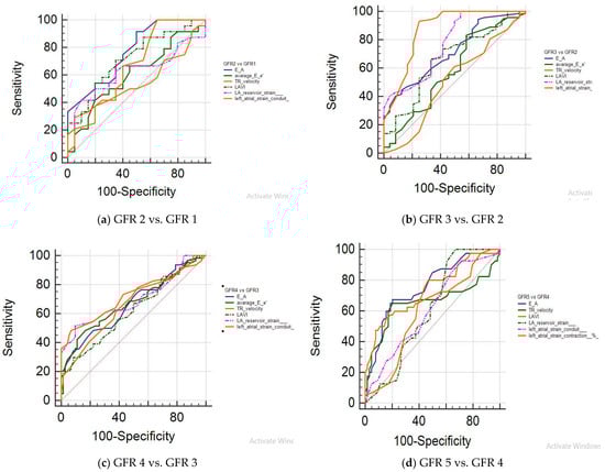 The diagnostic performance of the studied markers among the GFR groups is described in Table 2. The GFR groups were subgrouped and compared based on the studied markers. The sensitivity, specificity, and AUC are indicated. The findings of the study showed statistically significant findings for E/A, LAVI, and LAScd among all subgroups (p ≤ 0.01). The comparison of GFR 3 vs. GFR 2 showed statistically significant findings for LASr (p ≤ 0.01). The comparisons of subgroup GFR 4 vs. GFR 3 and GFR 4 vs. GFR 5 showed >90% specificity for LAVI, LASr, and LAScd, and statistically significant findings for both subgroups were observed with all of the markers (p ≤ 0.01). An AUC more than 0.7 was seen for E/A and LAVI in GFR 2 vs. GFR 1; E/A, LASr, and LAScd for GFR 3 vs. GFR 2; LAScd for GFR 4 vs. GFR 3; and E/A and LAVI for GFR 5 vs. GFR 4. The receiver operating (ROC) curves of GFR subgroups using the studied markers are shown in Figure 3. The AUCs of the subgroups using the remaining markers were <0.7, as shown in Table 2 and Figure 3.