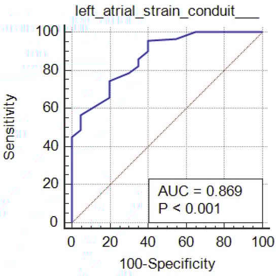 The diagnostic performance of the studied markers among the grades of the diastolic function is mentioned in Table 3. Based on comparisons of grades with studied markers, their sensitivity, specificity and AUC revealed statistically significant findings for grade 3 vs. grade 2 (p ≤ 0.01). All the markers except LAVI showed significance for grade 2 vs. grade 1 (p < 0.05). Grade 1 vs. grade 0 showed statistical significance with LAVI (p < 0.0001) only. LA reservoir strain and LA strain conduit can significantly diagnose LV diastolic function in CKD patients (p < 0.001; AUC = 0.819 and 0.869, respectively) at cutoffs of ≤36 and ≥23, with 86% and 95.5% sensitivity, 65% and 60% specificity, 96.1% and 96% PPV, and 31.7% and 57.1% NPV, respectively. Table 3, Figure 4; Figure 5. LA strain contraction cannot diagnose LV diastolic function in patients with CKD, as shown in Table 3,